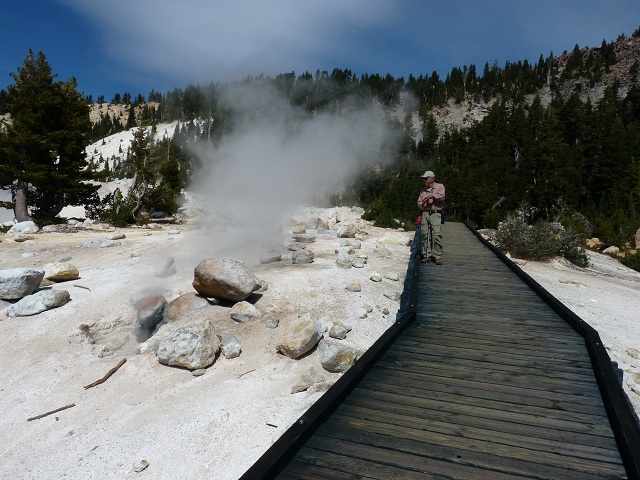 According to Patrick many of the campground's guests were there in search of their own steelhead, often staying for a couple of weeks, some never landing one. It had to be beginner's luck, nevertheless, Phil enthused with a new passion for steelhead fishing, headed to the river again early the next morning. Here he was joined briefly by a rather curious black bear. Again, he hooked a steelhead, this one a hatchery bred fish. Now he was becoming blasé, this time we weren't treated to his ecstatic "steelhead dance" but did enjoy a tasty steelhead supper, which was shared with our Alaskan neighbours. Incredulous of his luck, Patrick not only divulged to Phil his secret fishing hole, downstream of our campground but also lent him his car in which to get there, so he could leave his recuperating wife in peace. Here Phil struck out but back at camp that evening, another 5 lb hatchery steelhead was bagged. His luck still wasn't over, next morning he hooked another large fish but this wily trout managed to shake out the hook with a well timed leap. Serendipity had lead us to Del Loma but it had brought and end to Phil's run of being "skunked" by steelhead. As we were in the neighbourhood, relatively speaking, we decided to make another attempt at visiting Lassan Volcanic National Park. In July we had been prevented in our attempt by lingering snow, hard as it was to believe. Now, in September, the road was open, at least until the snow began to fall again and we were able to enjoy the fabulous scenery on the drive by Lassen Peak, a mere 8512 feet high. Harvey huffed and puffed his way over the summit and we arrived at the park's most active volcanic area, named Bumpass Hell. Hell was quite an appropriate description at the time of our visit, which coincided with that of around 60 schoolchildren on a field trip. We became entangled with their party somehow and passed the time on the hike down to the bubbling geysers counting the number of times we heard the words "like" and "awesome" during our trip! |