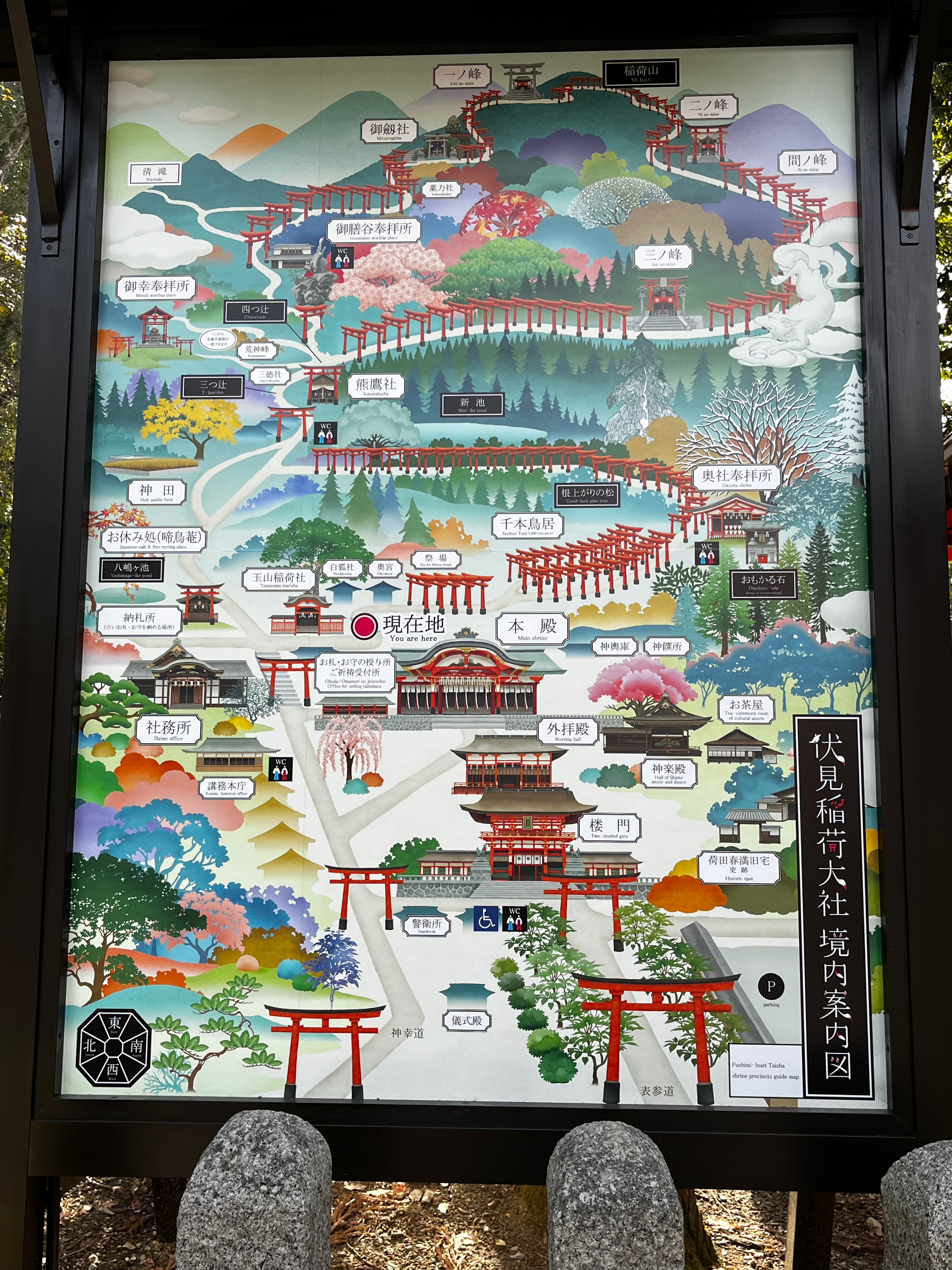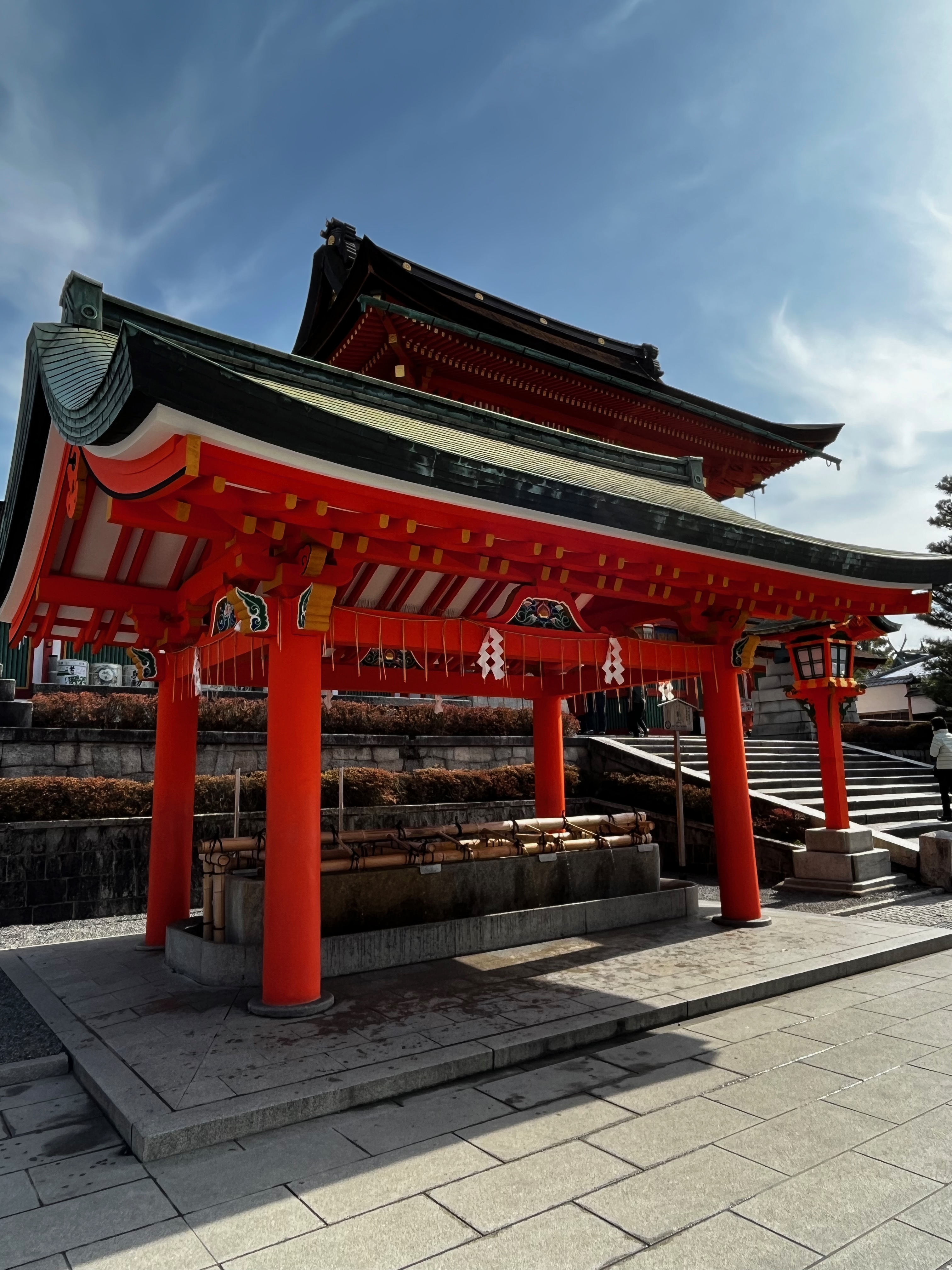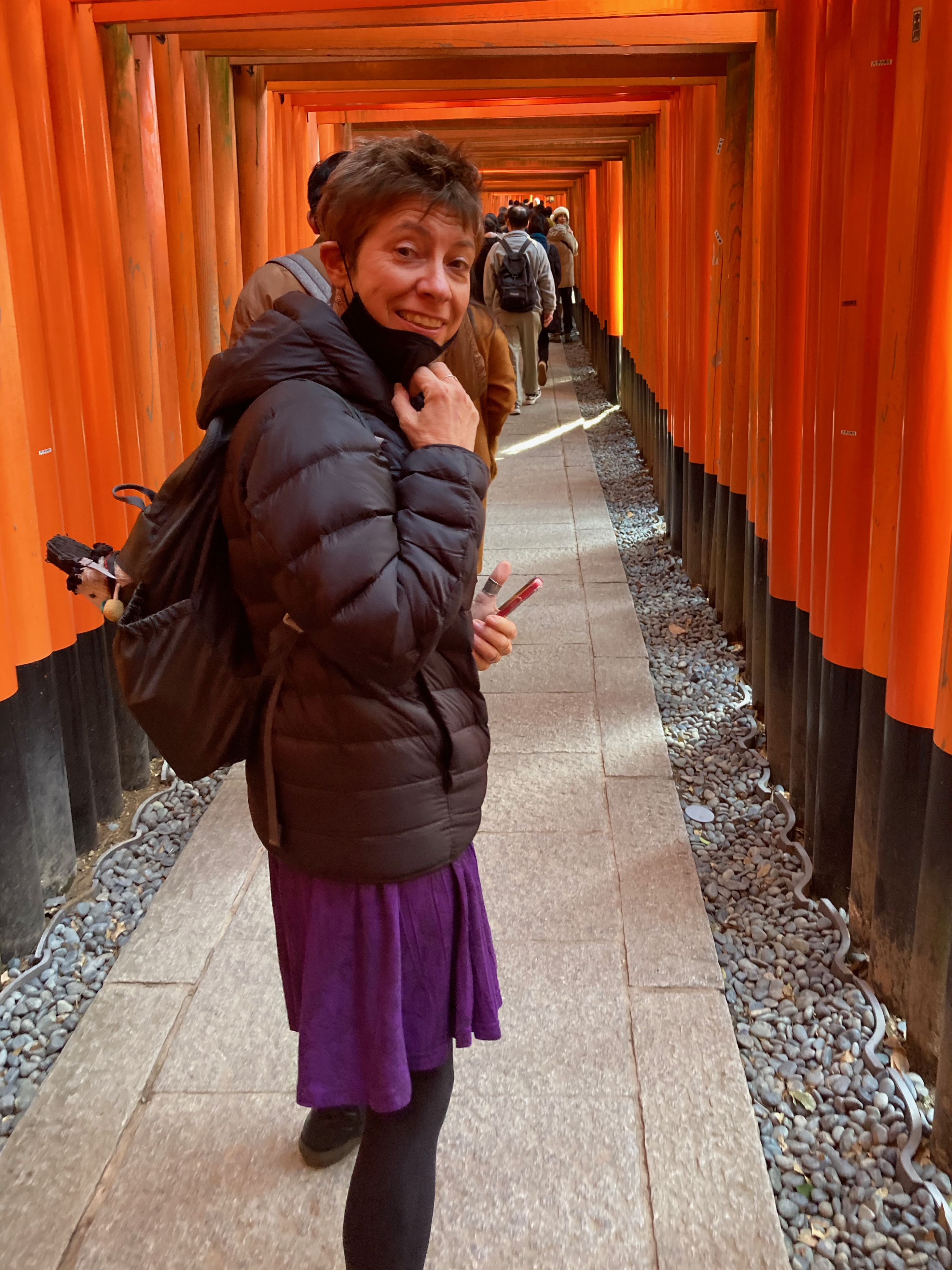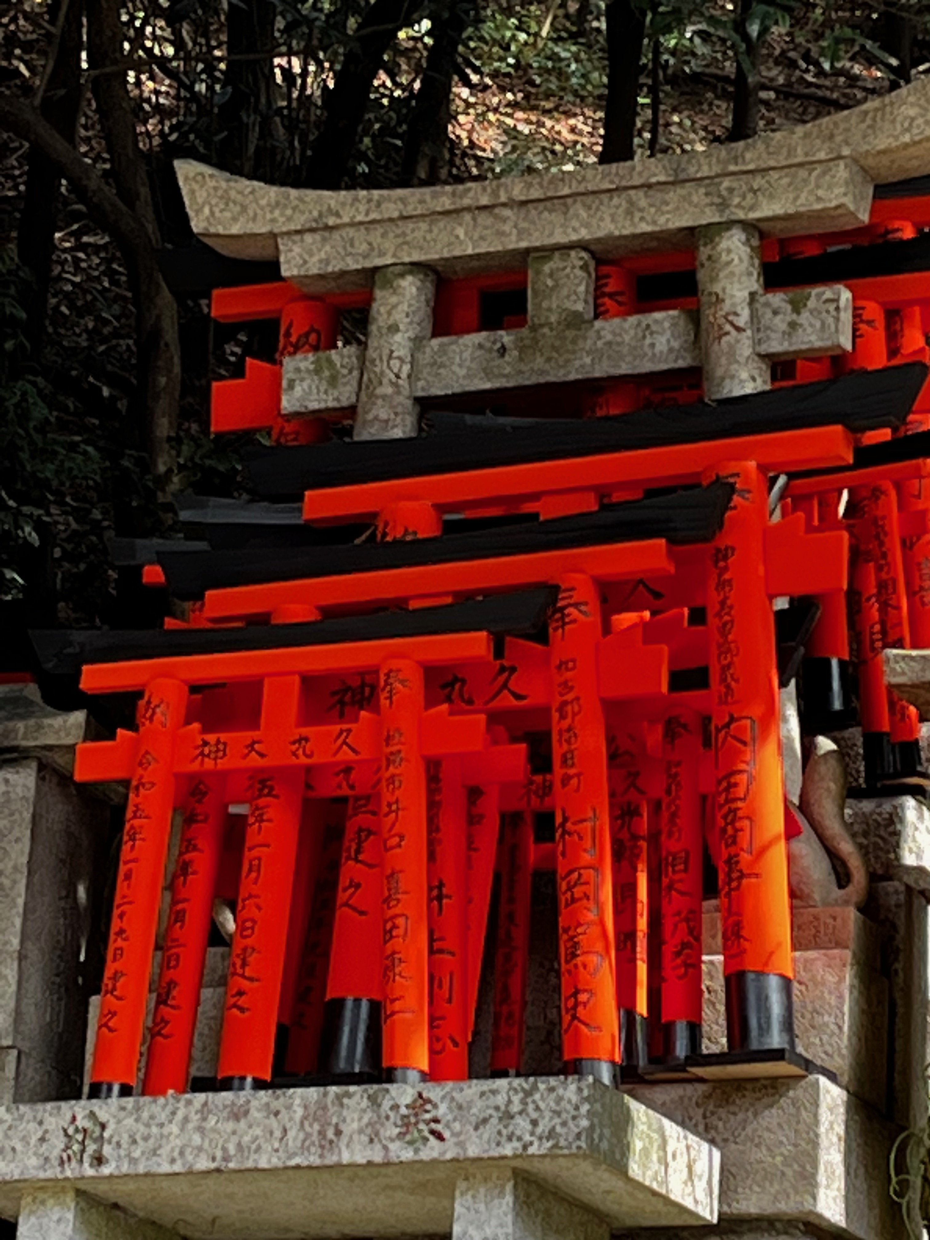 The day began with us taking the Keihan Line train south to visit Fushimi Inari-Taisha shrine. A stunning place with torii or shrine gates creating surreal pathways up a wooded mountain side. The entire route covers about 4 kilometres and walkers pass many religious icons, in particular foxes, along the way. The fox was a messenger of Inari, god of cereals, and are also just referred to as Inari. They often carry the key for the rice granary in their mouths. The walk to the summit and back was a beautiful if tiring experience.