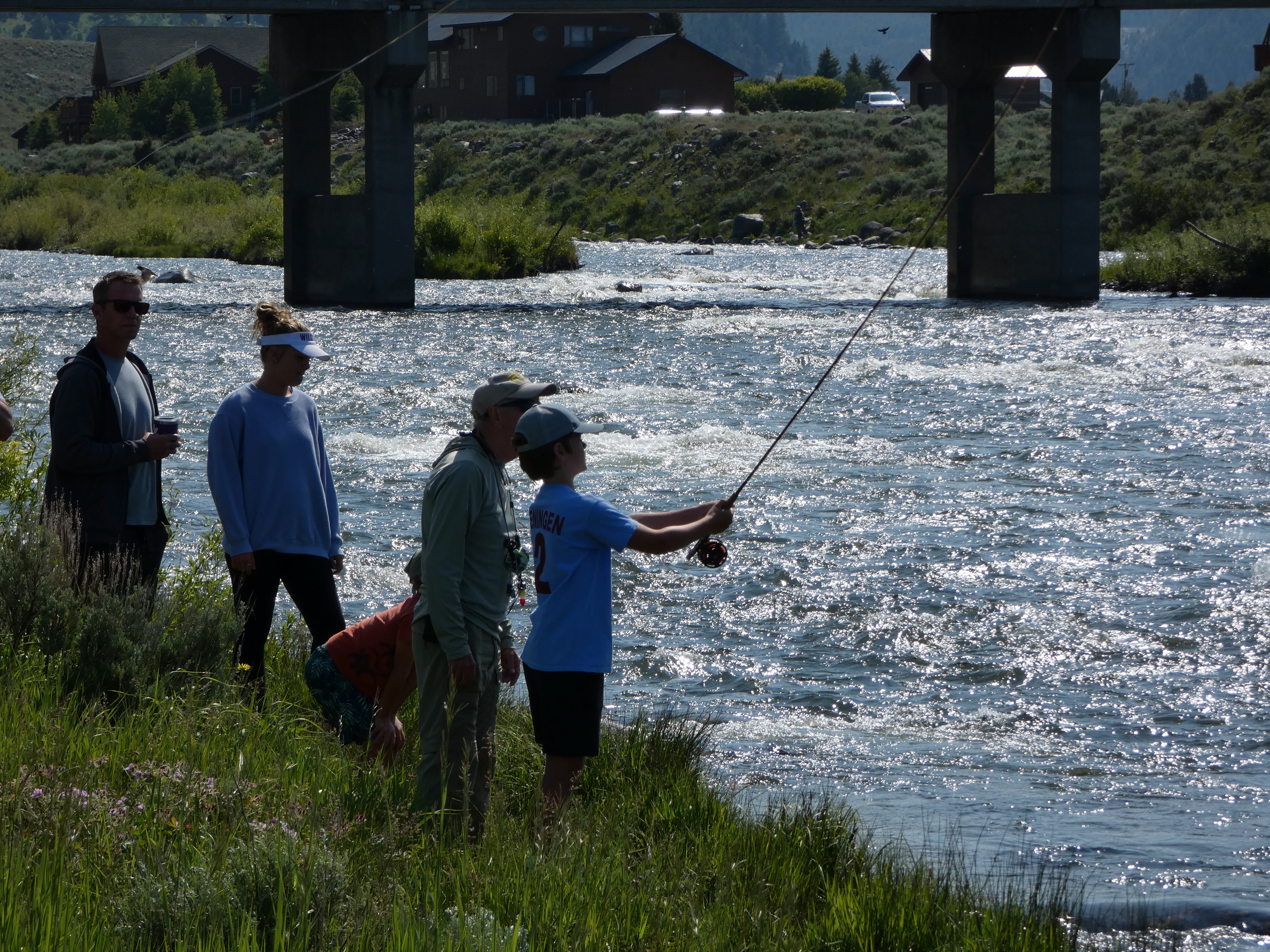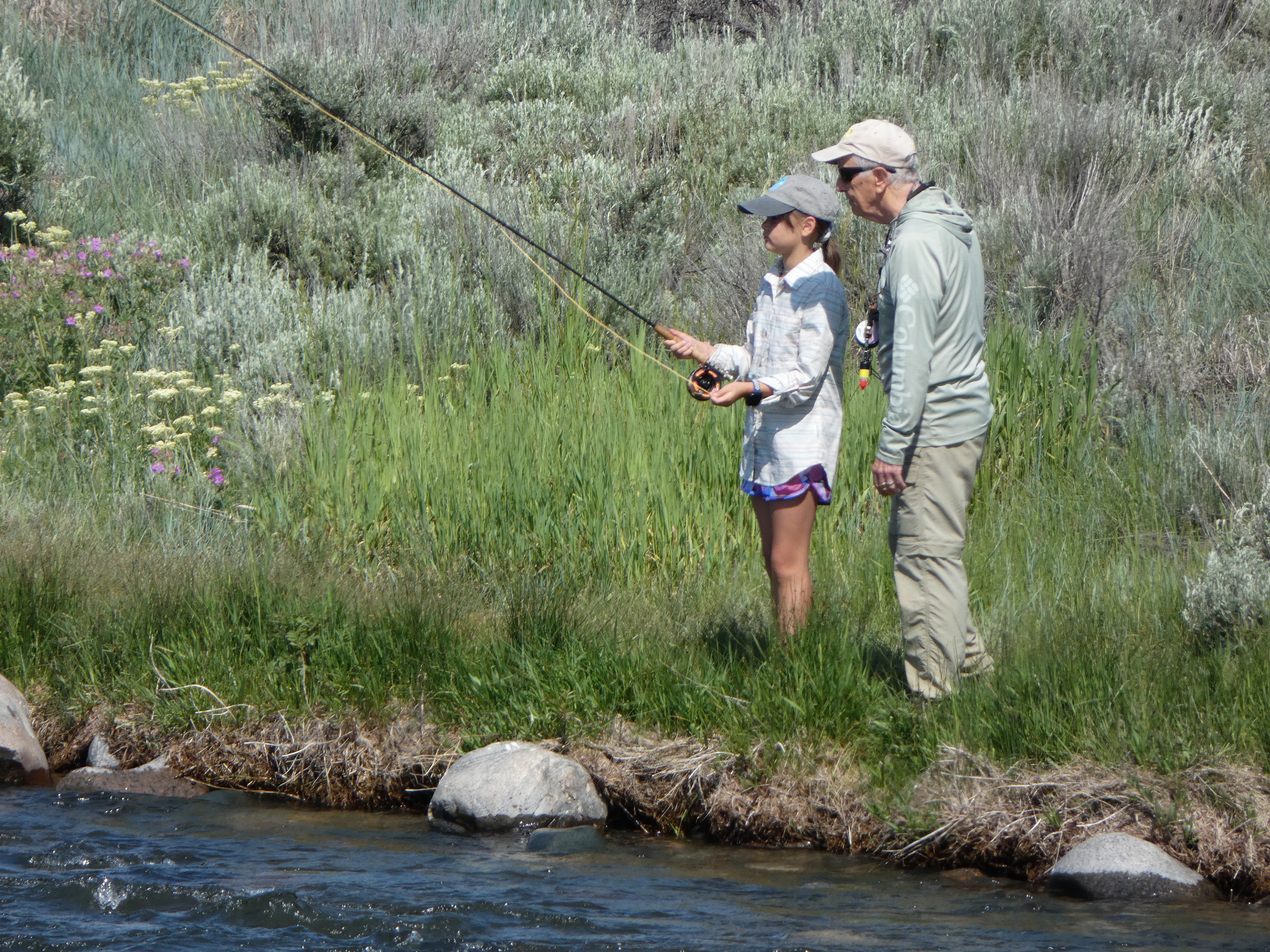 Our nonagenarian friend Ron arrived at Raynold's Pass after a gruelling drive of over 2000 miles from his home in Pennsylvania. His grandson and family, on holiday in Idaho at the time, paid him a visit and Phil enjoyed teaching Ron's great-grandchildren to fly fish. |