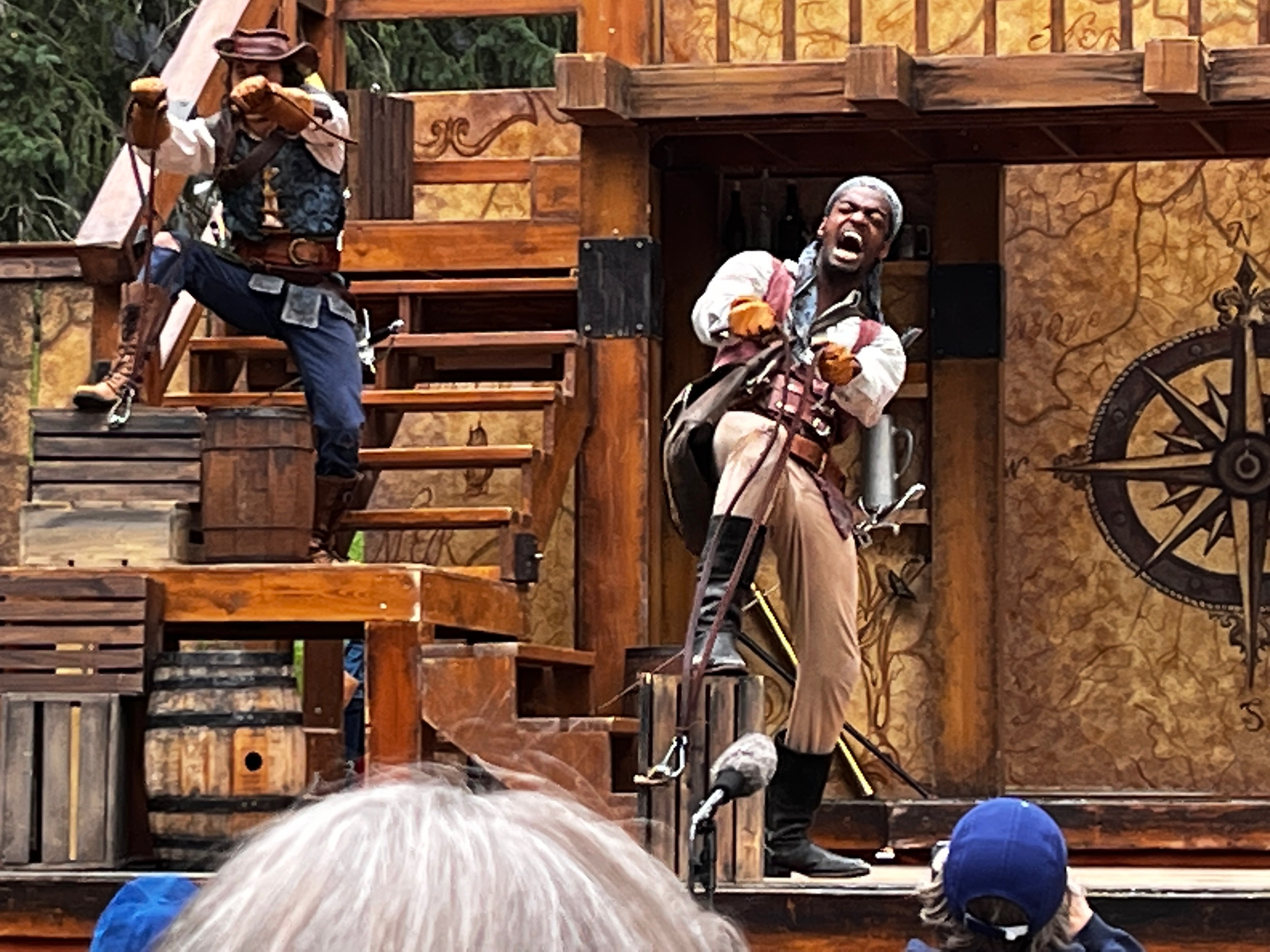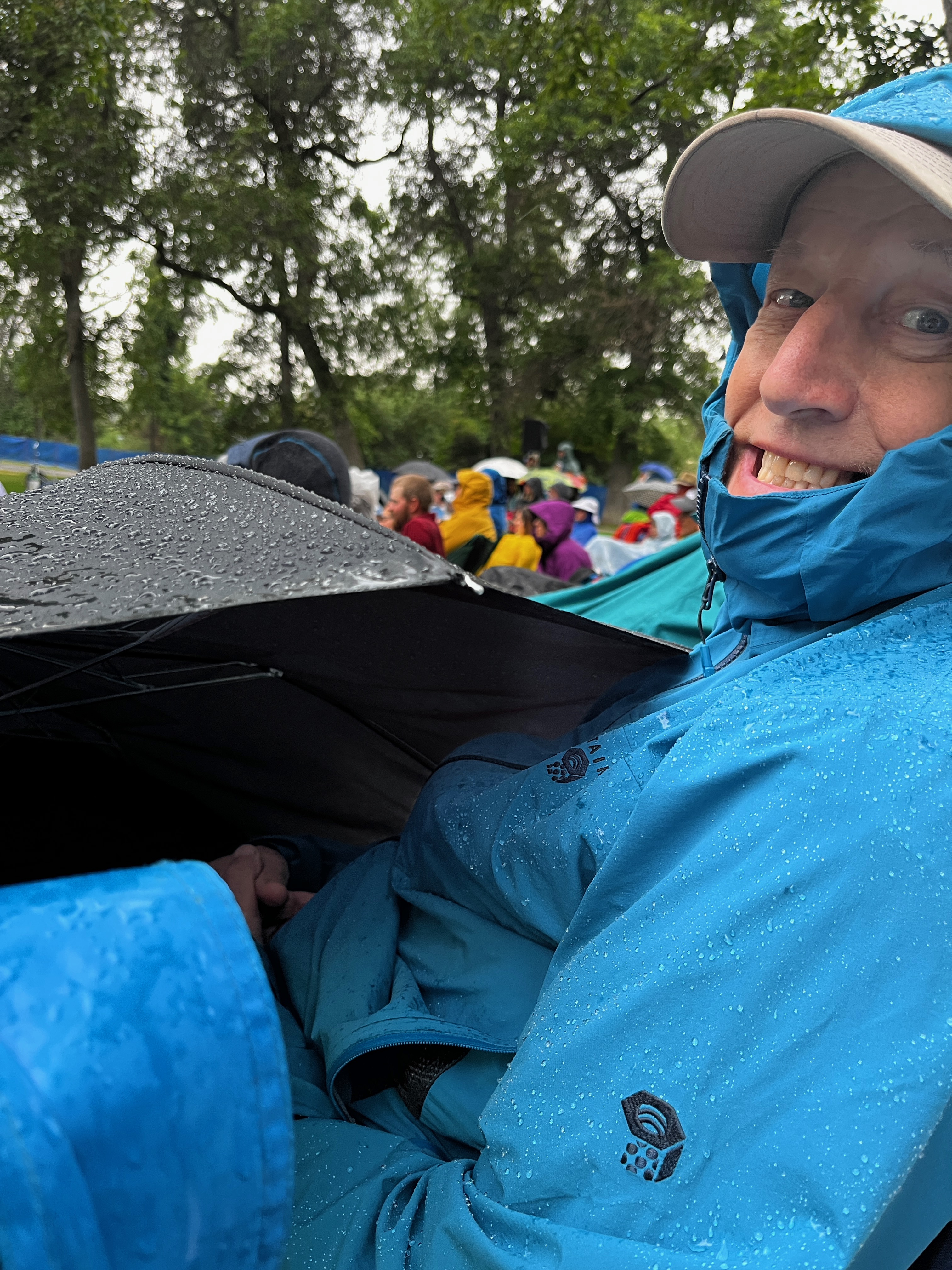 Back in Bozeman it was time for the annual Sweetpea festival of the Arts. As usual, the festival opened with a performance by Shakespeare in the Parks, the theatre company based in Bozeman who spent each summer touring the state to bring theatre to those in more remote locations. The play was, as usual, excellent, until the thunderstorm hit. The actors bravely battled on in pouring rain until it became ridiculous. We decided against sitting in the pouring rain to see if the performance would resume and took ourselves back to our temporary home in Charlie and Heidi's yard, where they had kindly allowed us to camp. |