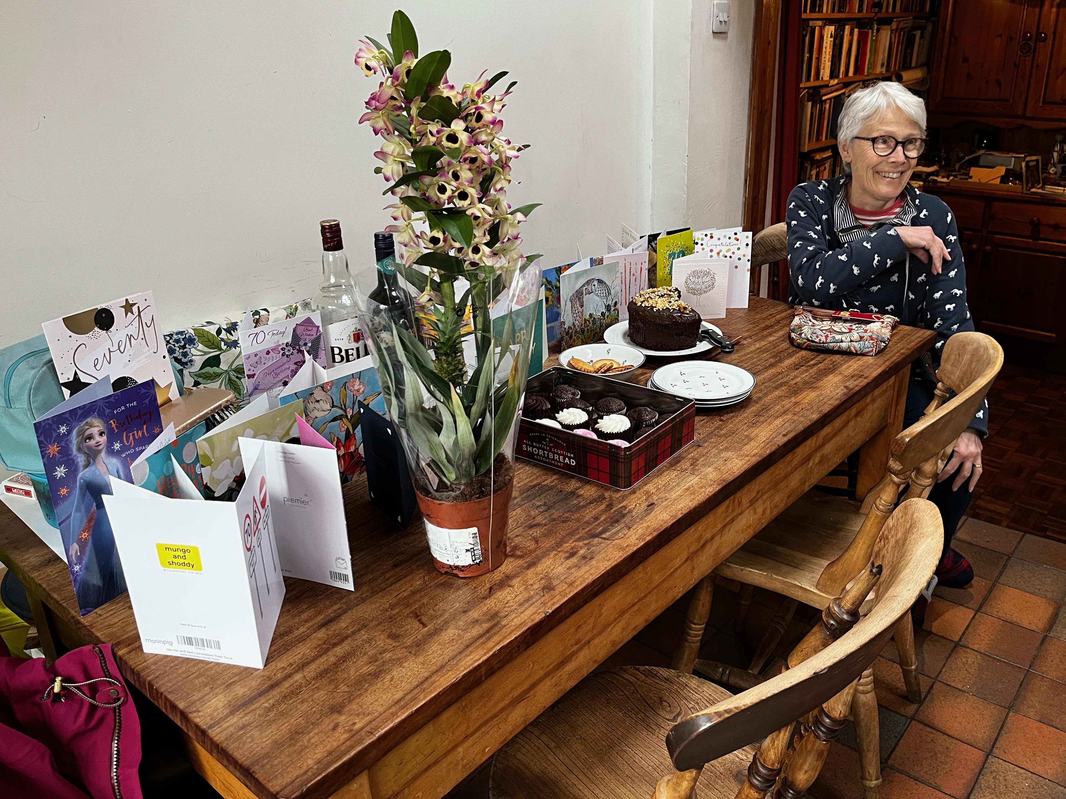 Celebrating Angie's 70th in style and a poetry reading from Gwyn. |