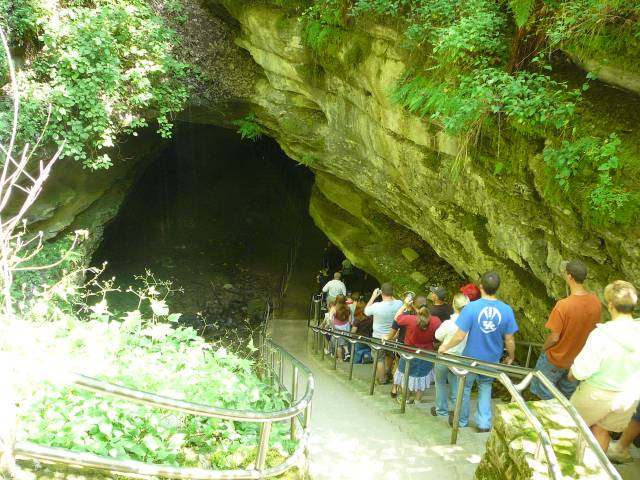 The cave system was so immense that even as we approached the entrance we felt the icy cold air rising out of the caves from a couple of hundred metres away. We were glad we'd dressed more warmly, despite the hot and humid weather outside the caves. Before we entered the cave system, our ranger again offered people a last chance to opt out of visiting the caves and get their money back. "This is not the tour for you if you are claustrophobic or afraid of heights," we were told. We looked at one another, one a claustrophobe and one with a fear of heights, hmmm. We decided to "feel the fear and do it anyway", heading apprehensively down the stairs to the cave. In our two hour tour, we only visited a tiny fraction of the cave system. Highlights (or terrors) of the tour included the "bottomless pit", a deep pit alongside the walkway, several hundred feet deep. "Fat Man's Misery" was a section of the tour which needed some agility and would surely live up to its name, but the claustrophobe made it through with sanity intact. There were several large chambers in the network of narrower caves and one was even used for church services in the past. Apparently the minister wanted to be sure that his congregation would stay right through his sermon, which he did by making sure he had the only lamp! When our ranger turned out the lights, the darkness was certainly very intense. Don't worry, she told us, even if the lights went out, all the electronic gadgets and gizmos carried by the tourists would generate enough light for us to find our way out! She had us turn on digital cameras and cell phones to demonstrate how much light they produced, which was pretty amazing. Finally we came to the long, fire-tower-like stairway which would lead us upwards and back out of the cave. We were glad to see daylight at the top, despite the heat! |