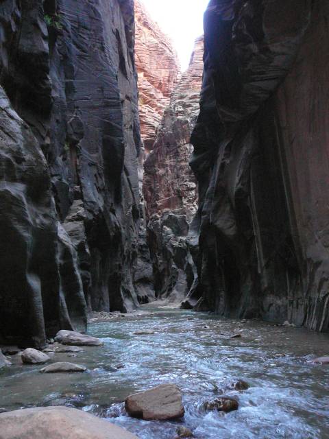 The sticks also gave the added advantage of being able to test the depth before placing your feet. We saw several people discover unexpected deep holes, into which they disappeared up to their necks! The going was slow and by the time we were making our way back, the light was fading. We were surprised to pass several groups and individuals just setting off up the canyon as we headed back. It wouldn't have been a trip we'd have liked to make in poor light! On our return trip we sat for a while and watched a bat flying over the river, dining on bugs. We were happy to make it back to the bus stop with no twisted ankles, broken bones or wet clothes! |