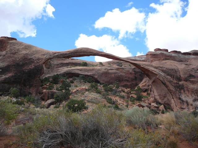 We turned eastwards through Capital Reef National Park, pressing on in view of the weather, with which we played hide and seek all the way to Moab. Here we camped at a commercial campground ready to visit Arches National Park the following day. Perhaps we had rock fatigue or maybe it was the combination of weather, crowds and roadworks on the narrow roads, but our visit to the Arches National Park was fairly short. We managed to find a parking spot after the 20 mile or so drive to the Devil's Garden area. Here we hiked to see the delicate and fragile looking Landscape Arch, a true geological marvel. Before the rain caught us up again we had time to visit the Navajo and Pine Tree arches and spot a few native Bighorn sheep. |